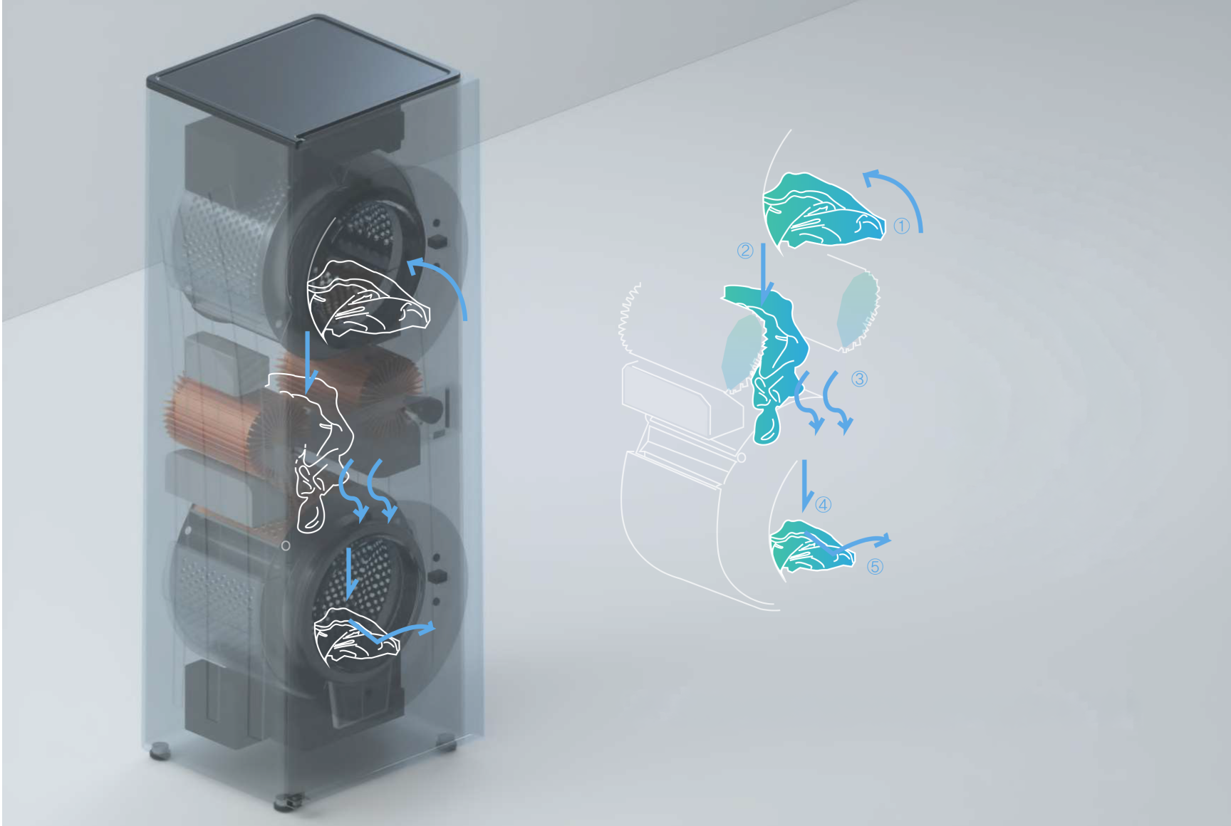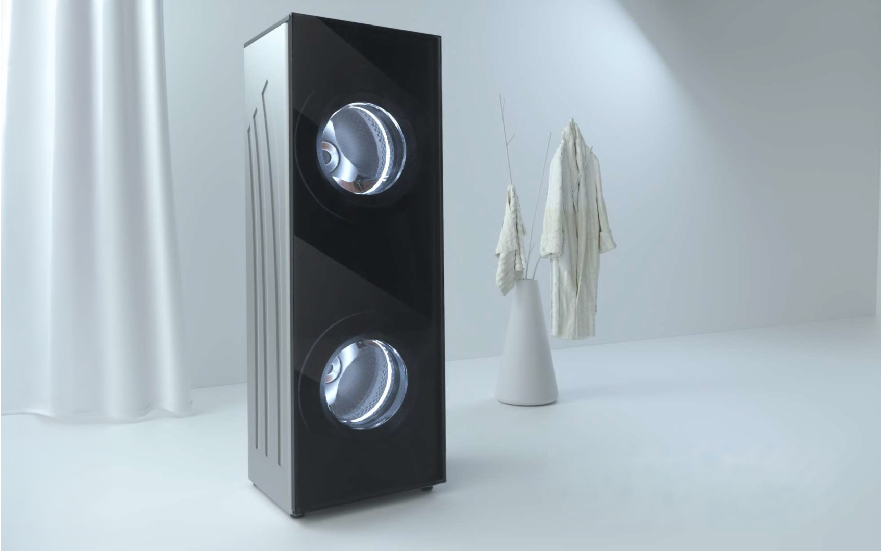 Two-Tier Tower Washer & DryerThis two-tier tower laundry system integrates a washer on the top and a dryer on the bottom to create a seamless wash-to-dry process. Once the washing cycle is complete, laundry is automatically transferred downward into the dryer, eliminating the need for manual handling. By removing the step of moving wet clothes, the system reduces physical effort and saves time, turning laundry into a continuous and effortless routine. Its vertical tower design also maximizes space efficiency, making it well suited for modern living environments.